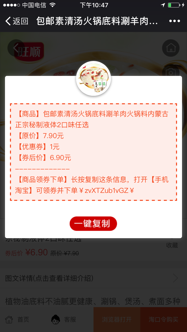 点击“淘口令购买”可以一键复制,方便快捷,直接打开手机淘宝就可以下单购买,浏览器打开方式也非常便捷。